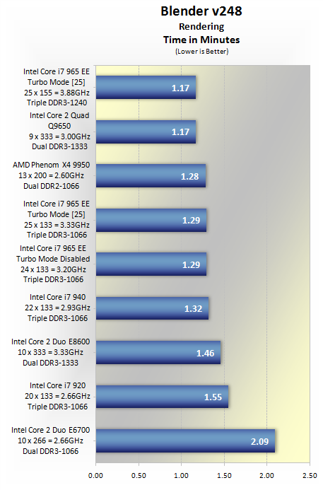 Los procesadores Core i7 no parecen tener la ventaja de desempeño que hemos visto en pruebas anteriores al enfrentarse a ScienceMark. Por ejemplo, el Core 2 Duo E8600 que tiene una velocidad agresiva pudo derrotar al Core i7 920 y Core i7 940. El Core i7 965 Extreme Edition fue más rápido ya sea con el modo Turbo activado o desactivado y al overclockear a 3,88GHz logró anotar unos impresionantes 2406 puntos.. Blender es una aplicación de código abierto para crear animaciones 3D que está disponible para varios sistemas operativos de manera gratuita. Esta aplicación es popular entre muchos estudios de animación independientes y desarrolladores de juegos por lo que probar el desempeño de estos procesadores en esta aplicación es relevante. Aparentemente la prueba Blender es otra que no favorece a los procesadores Core i7. Aquí el Core 2 Quad Q9650 fue capaz de igual el desempeño del muy overclockeado Core i7 Extreme Edition. Es un hecho que el Q9650 fue el chip más rápido de esta prueba, junto con el Phenom X4 9950 que también pudo derrotar a los procesadores Core i7. AutoMKV es una aplicación que permite la fácil conversión de un formato a otro usando codecs de terceros. Con AutoMKV y el códec x264, una decodificación H.264 gratuito, el usuario puede fácilmente crear archivos multimedia en varios formatos. En esta prueba los procesadores Core i7 realmente se destacaron, ofreciendo un desempeño excepcional que simplemente opaca al Phenom X4 y los procesadores Core 2. Aunque el Phenom X4 9950 codificó el archivo en 18 minutos y el Core 2 Quad Q9650 en 15 minutos, el Core i7 920 lo logró hacer lo mismo en solo 11 minutos y medio.